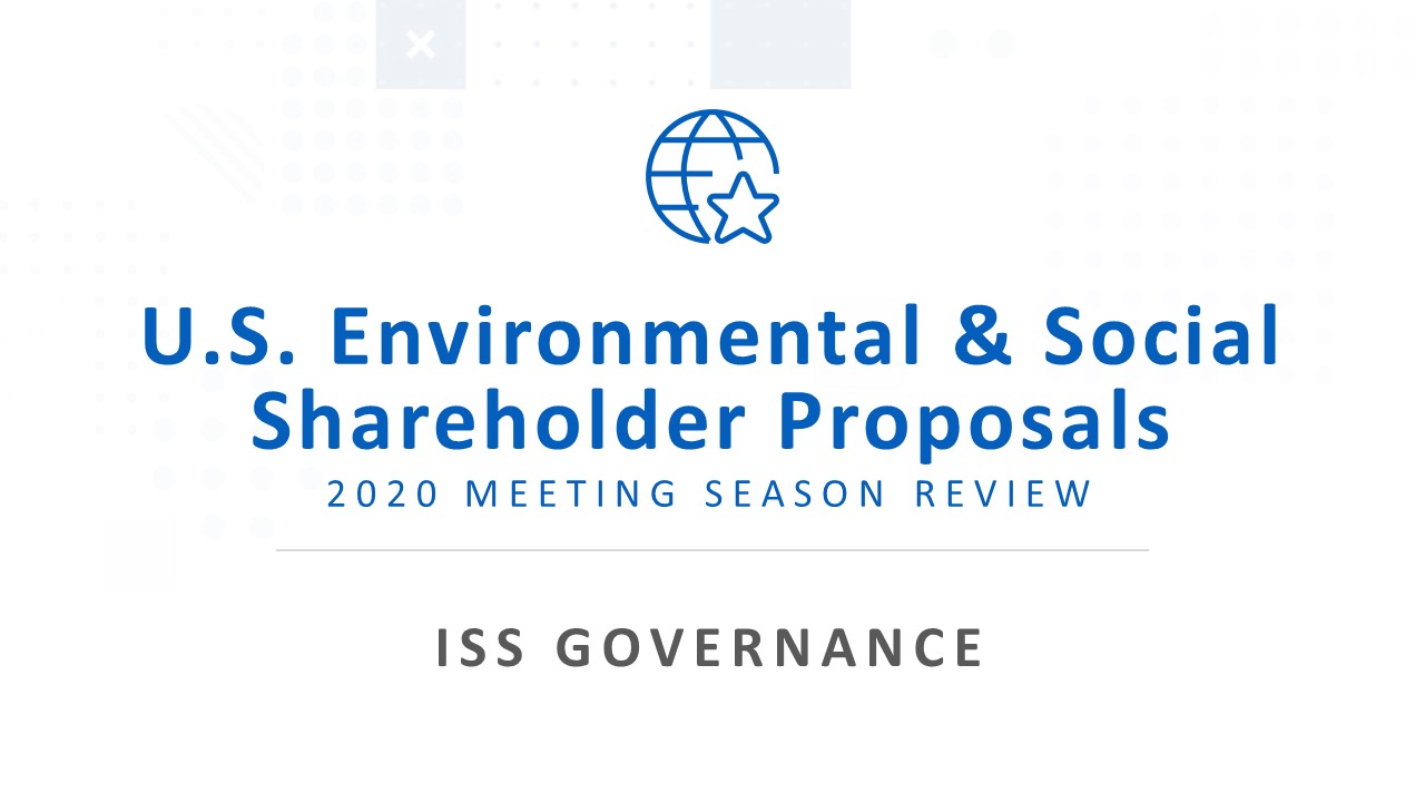 Below are key takeaways from ISS’ recently released 2020 U.S. Environmental & Social Shareholder Proposals Proxy Season Review. The full report is available to institutional subscribers by logging into ISS Link then selecting the Governance Exchange and its Report Center tab and to corporate subscribers by logging into Governance Analytics then selecting the Governance Exchange and the Report Center tab.