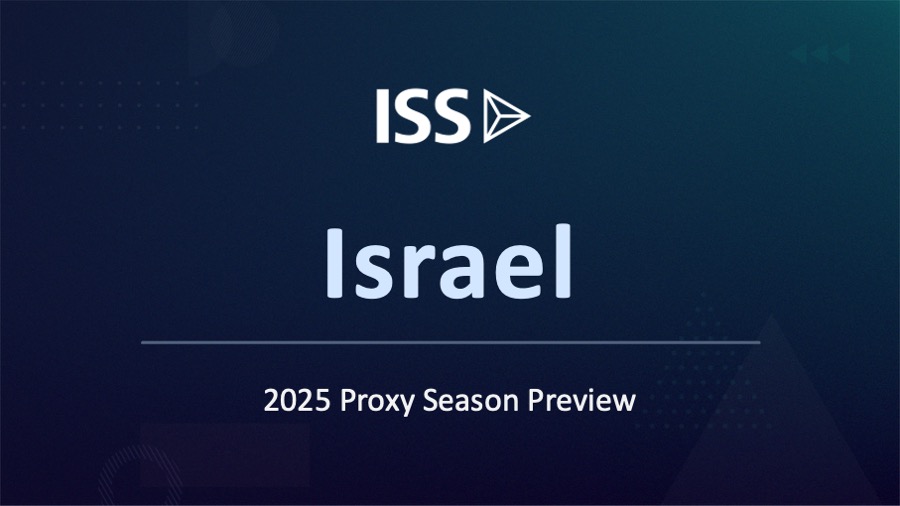 Below are key takeaways from ISS’ recently released 2025 Israel Proxy Season Preview. The full report is available to institutional subscribers by logging into ProxyExchange then selecting the Knowledge Center and its Library tab and to corporate subscribers by logging into Compass then selecting Governance and the Governance Library or Governance Exchange tab.