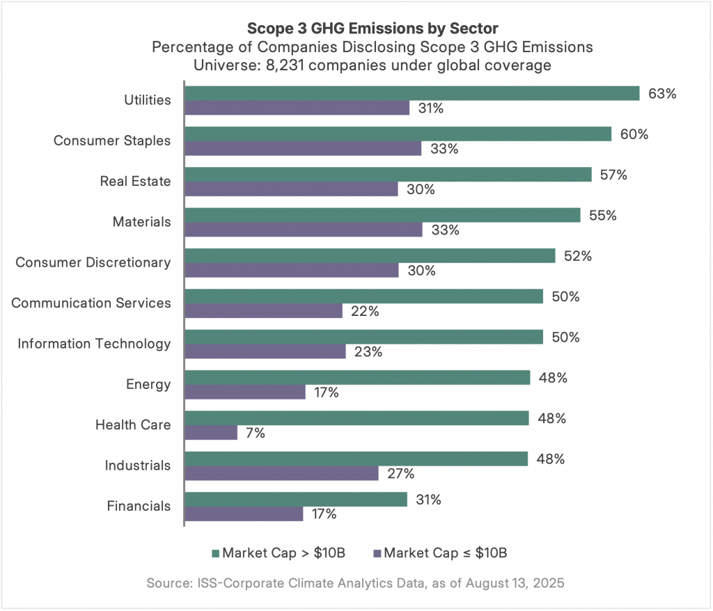 Currently, approximately 29% of the 8,231 publicly traded companies in ISS’s global coverage report Scope 3 emissions; this figure rises to 48% for large-cap firms (market cap exceeding $10 billion). As illustrated below, Scope 3 disclosure rates vary considerably by sector, with Utilities, Consumer Staples, and Real Estate leading the way.