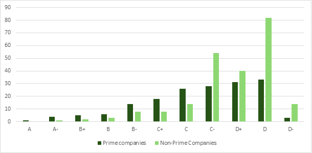Note: Data is recorded on a scale from A (best performance) to D- (worst performance). Companies are awarded Prime Status if the overall ESG Corporate Rating letter grade meets or exceeds the industry-specific Prime threshold defined by the Industry Classification Matrix. The Prime threshold reflects the overall magnitude of an industry’s risk exposure and footprint. The indicator here assesses the energy efficiency measures and use of renewable energy in owned data centers as well as implementation of related strategies, which could include relevant targets, progress reports, and phases of measures.