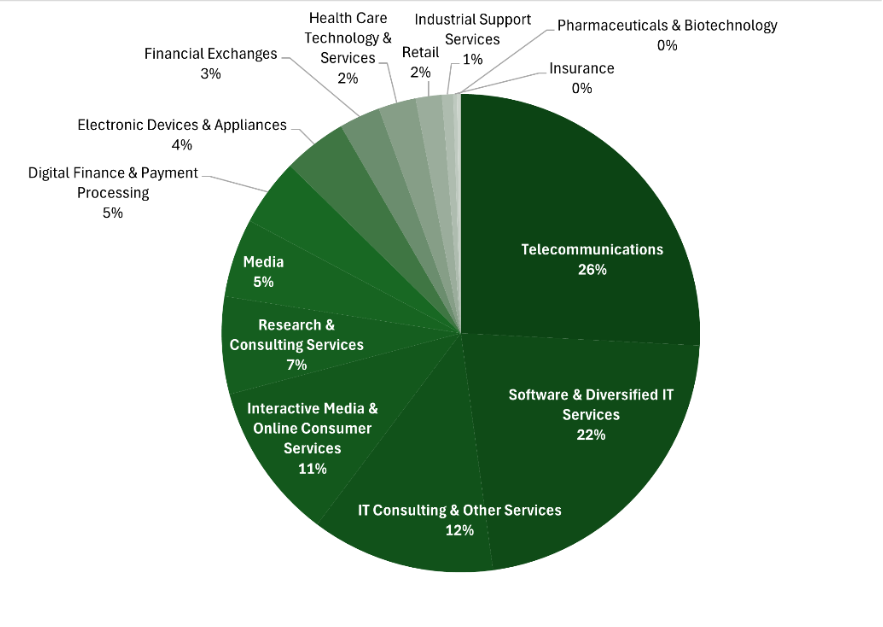 The energy efficiency strategies of 395 public companies that own or operate data centers were analyzed. These companies are part of the ESG Corporate Rating universe and represent a diverse set of industries in which the companies own data centers as part of their operations: Telecommunications, Software & Diversified IT Services, IT Consulting & Other Services, Interactive Media & Online Consumer Services, Digital Finance & Payment Processing, and Healthcare Technology & Services, among others. Figure 1 illustrates the industry-wise breakdown of these entities.
