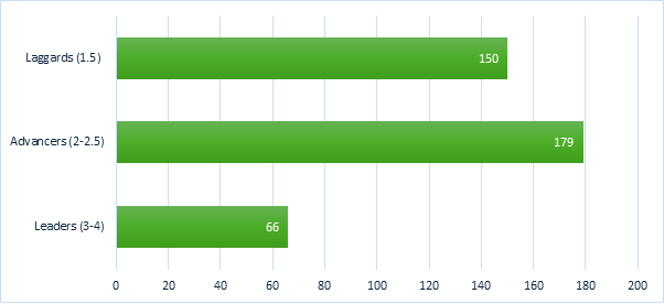 A numeric scale, with 4 being excellent performance and 1 representing poor performance, was used to assess the company’s strategies to increase energy efficiency and renewable energy in data centers. Figure 3 indicates that most companies have limited disclosures on the subject, such as a general commitment (laggards) or some measures/strategy but no information on implementation (advancers); this implies that both these categories lack comprehensive disclosures.