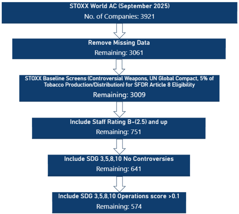 The first step is to remove from the STOXX World AC index universe companies for which data is missing or that do not pass the STOXX Baseline screens (controversial weapons involvement, violating UN Global Compact standards, or deriving more than 5% of their revenue from tobacco production or distribution).